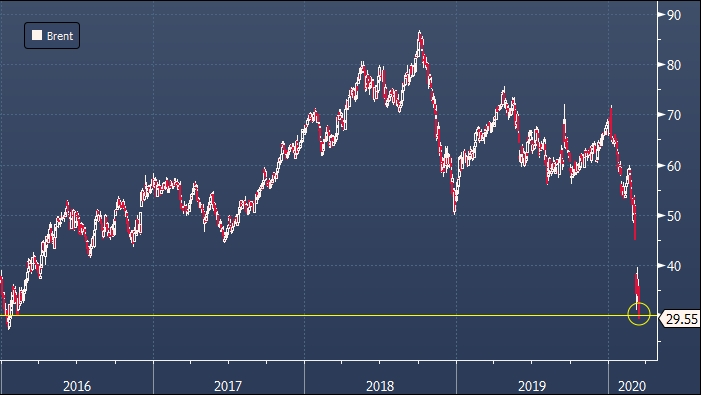 Фьючерсы на нефть Brent по итогам торгов в понедельник, 16 марта, упали на 12,5% до $29,61 за баррель. Впервые за 4 года и 3 месяца торговая сессия закрывается ниже $30 за баррель. С начала года североморский сорт упал на 55%.
