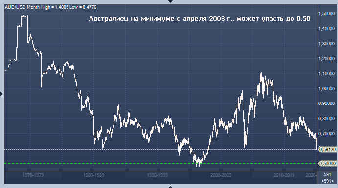 Австралийский доллар упал до 0.5933 за доллар в среду, самого низкого уровня с 2003 года, в преддверии выступления в четверг главы Резервного банка Австралии Филипа Лоу, который может дать старт нетрадиционной денежно-кредитной политике. Киви коснулся более чем десятилетнего минимума 0.5868, после того как и его центральный банк снизил ставки и сказал, что QE исключать нельзя.