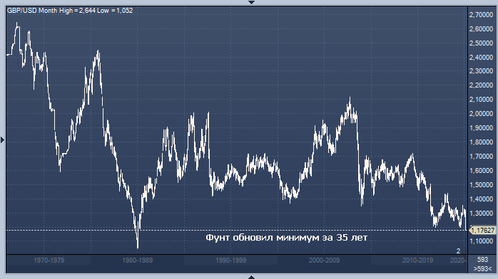 Британский фунт упал до самого низкого уровня по отношению к доллару за 35 лет, что является отражением сильной подверженности экономики Великобритании замедлению мировой экономики из-за пандемии коронавируса. Стерлинг, который резко снизился в последние дни, упал в среду еще на 2.6% по отношению к доллару — до 1.1756 доллара.