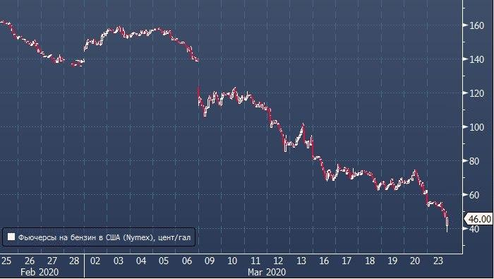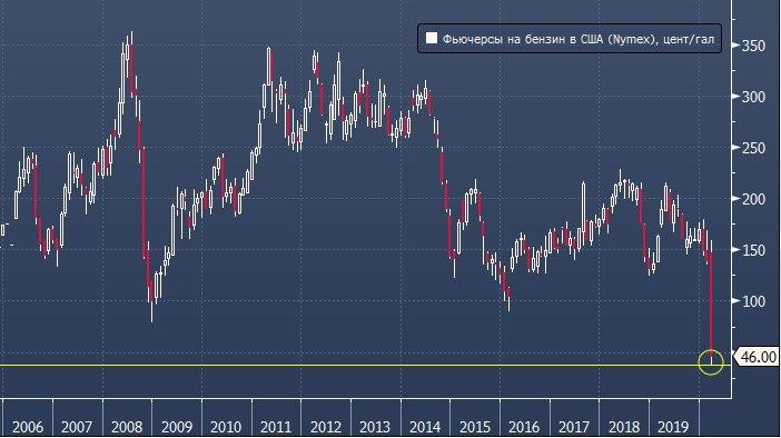 На торгах в понедельник фьючерсы на бензин на Нью-Йоркской товарной бирже рухнули до рекордно низких значений с 2006 года, когда этот инструмент был запущен (ProFinance.ru: до этого цены были так низки в 2001 году). В моменте цена бензина снижалась на 30% с лишним и доходила до 38 центов за галлон (3.785 литров), что по текущему курсу доллара к рублю составляет примерно 8 рублей за литр.