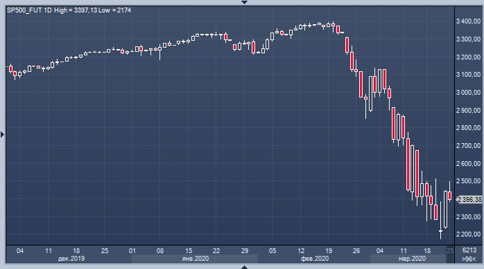 Фьючерсы на американские фондовые индексы начали торги в среду с роста — рынок позитивно воспринял достижение соглашения в Конгрессе США по плану поддержки экономики на $2 трлн. Голосование по нему пройдет сегодня и, как ожидается, будет успешным. Однако восходящая динамика на рынке акций оказалась неустойчивой — свежих драйверов для развития восстановления не наблюдается, и инвесторы предпочли взять паузу после вчерашнего бурного ралли, в ходе которого индекс Dow Jones Industrial Average показал максимальный рост за прошедшие 87 лет.