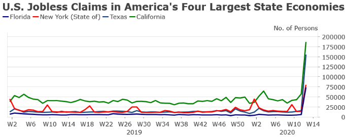 На неделе до 20 марта 3.283 млн американцев подали первичные обращения за пособием по безработице, сообщило сегодня министерство труда США (ProFinance.ru: график в начале статьи отражает соответствующую динамику в четырех крупнейших с точки зрения экономики штатах США). Это число не только в два раза превысило консенсус-прогноз, но и стало рекордным значением за всю историю. Предыдущий рекорд в 695 тысяч обращений был зафиксирован на неделе до 2 октября 1982 года, отмечает Wall Street Journal.