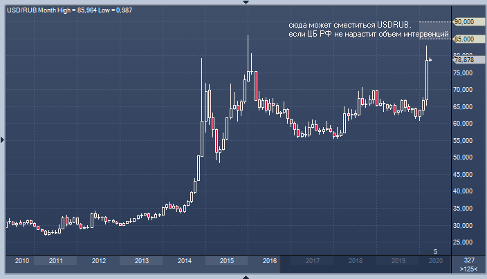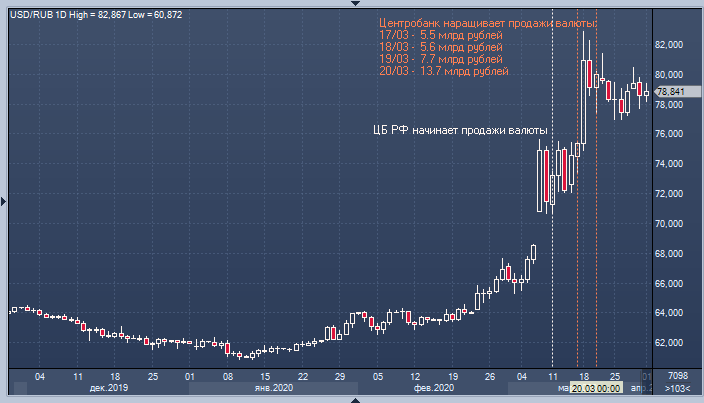 В Райффайзенбанке отмечают, что в апреле объем продаж валюты ЦБ РФ будет на уровне текущих дневных объемов около 16 млрд рублей и в месяц составит порядка $4 млрд — $5 млрд. Для предотвращения ослабления рубля регулятору необходимо будет увеличить интервенции — в противном случае можно ожидать смещения USDRUB к уровням в диапазоне 85 — 90 рублей за доллар США.