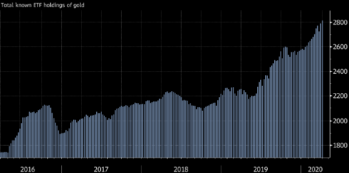 На прошлой неделе крупнейший «золотой» биржевой фонд GLD объемом $50 млрд привлек еще $2.9 млрд, что стало рекордным значением с 2009 года, пишет Bloomberg. По данным агентства, совокупный объем активов «золотых» ETF достиг во вторник свежих исторических максимумов (ProFinance.ru: в метрических тоннах, см. график ниже). Произошло это на фоне усиления «коронавирусных» страхов и роста спроса на защитные активы.