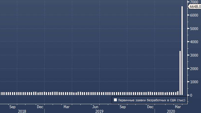 На прошлой неделе инвесторов потрясло известие о резком росте числа первичных заявок на пособие по безработице в США до рекордных 3.283 млн. Опубликованный сегодня отчёт продемонстрировал стремительное ухудшение ситуации: число заявок за неделю до 28 марта достигло нового максимума в 6.648 млн, что оказалось существенно выше прогноза экономистов в 3.763 млн. Данные за неделю до 21 марта были пересмотрены в сторону повышения до 3.307 млн.