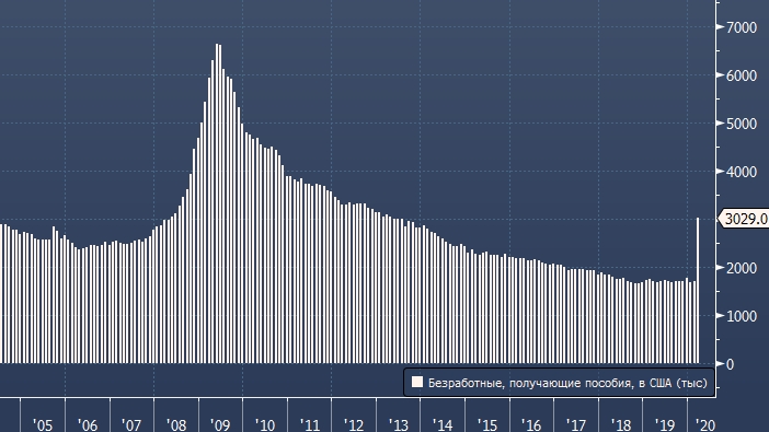 Закономерно резко выросло число лиц, получающих пособия по безработице: за неделю до 21 марта оно составило 3.029 млн человек. Однако рост показателя оказался слабее ожиданий в 4.941 млн, а данные за предшествующую неделю были пересмотрены с 1.803 млн до 1.784 млн.