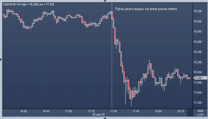 Ралли нефти с $26 до $36 за баррель в течение всего лишь 9 минут на фоне новостей из Саудовской Аравии и твита Дональда Трампа не оставила рубль равнодушным. Однако его реакция оказалась относительно сдержанной, что, впрочем, закономерно, учитывая, что более половины от занятых позиций нефть уже сдала. USDRUB на фоне ралли нефти спикировал от уровней выше 79 до 77.33, а EURRUB – от 86 к 84.15. В настоящее время эти пары демонстрируют снижение в 1% и 2% соответственно.