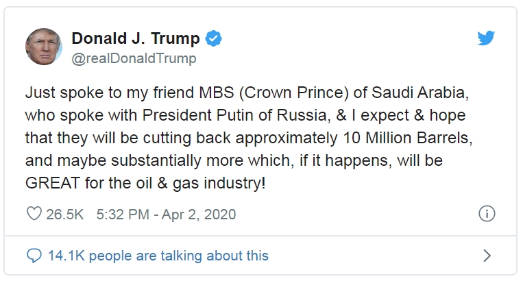 Президент позже сказал в твиттере, что сокращение производства будет ”большим для нефтяной и газовой промышленности!”