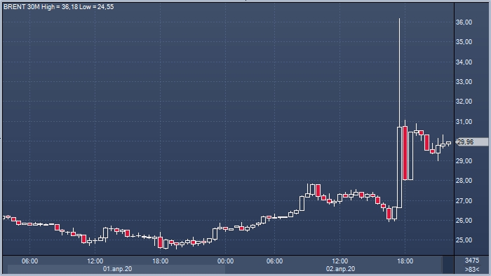 Цены на нефть Brent вечером в среду, 2 апреля, торгуются чуть ниже $30 за баррель. От котировок закрытия торгов в среду рост составляет более 20,5%, тем не менее это заметно ниже максимумов сегодняшнего дня сформированных выше $36 за баррель.
