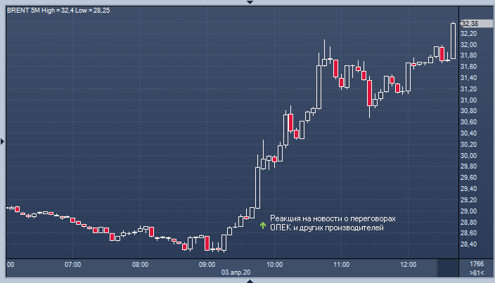 Цена нефти брент менее чем за три часа поднялась более чем на 11% и теперь держится у максимумов сессии $32.40. Оптимизм участников рынка поддержали новости о том, что члены ОПЕК+ в понедельник 6 апреля проведут встречу в формате видеоконференции, при этом в ней смогут принять участие и представители других стран-производителей нефти.