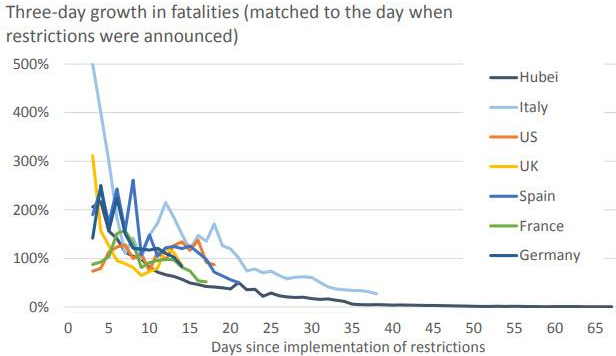 В провинции Хубэй после введения ограничительных мер трехдневные темпы роста смертельных исходов снизились с 200% до 63% в течение 14 дней (инкубационный период). В конце концов, карантин был снят через 63 дня после его введения. Отталкиваясь от этого, Deutsche Bank прогнозирует время окончания карантина в странах Запада: