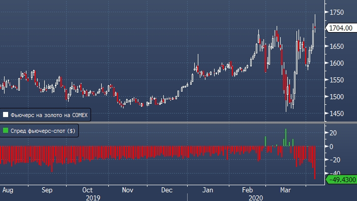 Котировки июньских* фьючерсов на золото резко подскочили в ходе торгов на COMEX в азиатскую сессию и достигли максимальной отметки за последние 8 лет в районе $1742.60 за тройскую унцию, при этом резко вырос спред относительно спота — здесь металл не дотянул мартовского пика и обозначил максимумы лишь в районе $1679.52.