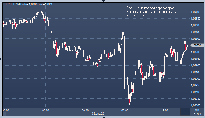 Оптимизм инвесторов несколько угас в свете новостей о том, что Еврогруппа в ходе 16-часовых переговоров так и не смогла согласовать общий европейский план поддержки экономики. В преддверии видеоконференции, начавшейся во вторник, президент Еврогруппы обещал принять пакет мер на общую сумму в 540 млрд евро, так что евро отреагировал на новости о провале весьма болезненно. Однако к настоящему времени европейская валюта уже восстановила большую часть потерь — Еврогруппа планирует возобновить переговоры в четверг, а надежда, как известно, исчезает последней.