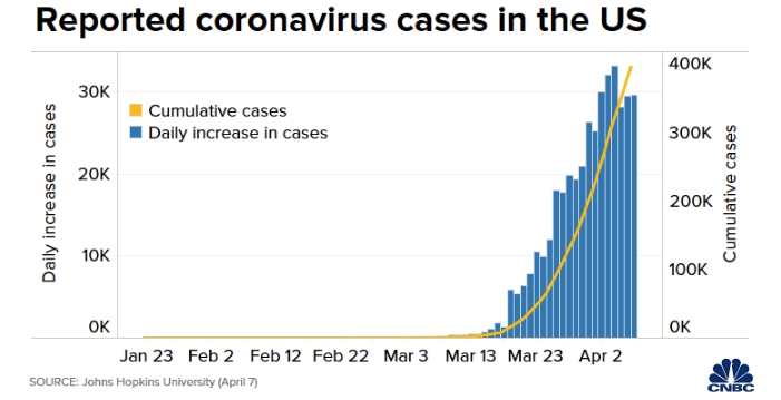 Число подтвержденных случаев инфицирования коронавирусом в США превысило 400 000 в среду, согласно данным, предоставленным NBC, с 12 864 смертельными случаями по всей стране.