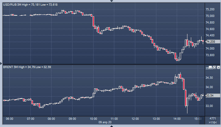 Рубль болезненно отреагировал на падение нефти на фоне новостей из Кремля: USDRUB отскочил с минимумов сессии в районе 73.61 и в настоящее время торгуется около 74.40. Чувствительность нефти, а с ней и российской валюты, к новостям, которые дает повод для сомнений в способности производителей нефти заключить сделку, предполагают риски плачевных последствий провала переговоров для рубля.