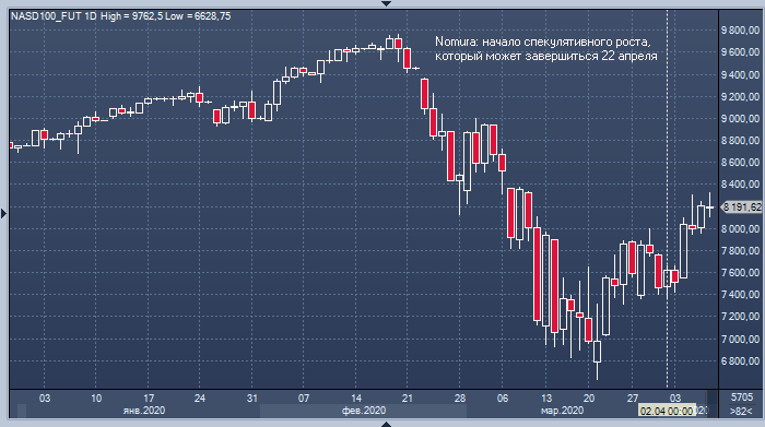 Эксперт проанализировал данные за период, прошедший с мирового финансового кризиса 2008 года, и обнаружил, что рынок достигает пика в среднем через 14 торговых сессий после того, как чистая позиция CTA-счетов во фьючерсах на NASDAQ100 становится бычьей. По оценкам Nomura, это произошло 2 апреля (или около того), поэтому разворота рынка можно ждать примерно 22 апреля (ProFinance.ru: см. график в начале статьи).