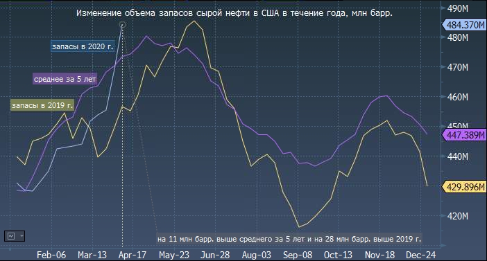 В преддверии публикации в среду еженедельных данных Минэнерго США по изменению запасов нефти и нефтепродуктов эксперты прогнозируют, что запасы сырой нефти увеличатся за неделю до 10 апреля на 12 млн баррелей после роста на 15 млн баррелей неделей ранее. Запасы бензина и дистиллятов, как ожидается вырастут на 7,3 млн и 2 млн баррелей соответственно. На предшествующей недели запасы бензина подскочили на 10,5 млн баррелей, а запасы дистиллятов на 476 тыс. баррелей.