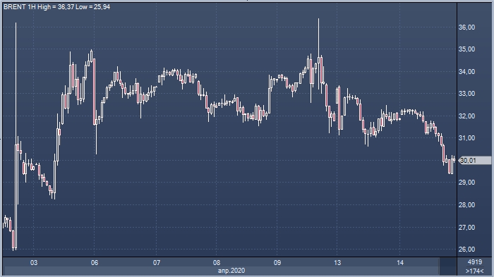 Цены на нефть упали во вторник, 14 апреля, поскольку фокус рынка от сокращения производства вновь повернулся к слабому спросу. Котировки Brent к вечеру снижаются на 5,3% до $30,05 за баррель, при этом котировки WTI падают на 7,7% до $20,70 за баррель.