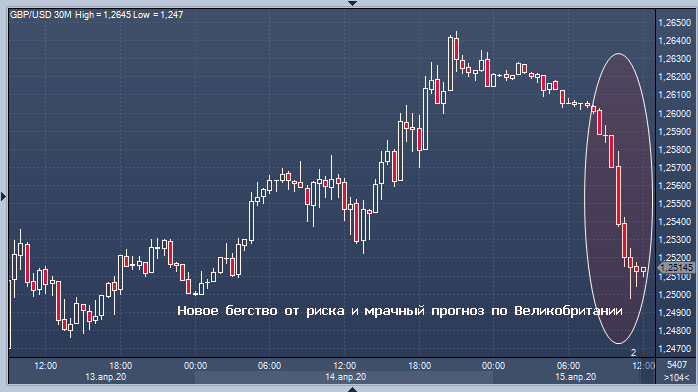 Фунт упал, поскольку инвесторы снова испытывают отвращение к риску, что вызвало глобальное укрепление доллара. Инвесторы напуганы неопределенность, связанной уже не с карантином, а с тем, насколько глубоким будет спад мировой экономики и какие проблемы он породит. Мрачные прогнозы экономического спада в Великобритании как отражение негативных глобальных перспектив вследствие воздействия пандемии коронавируса задали тон на рынках Лондона после возвращения сити с пасхальных каникул.