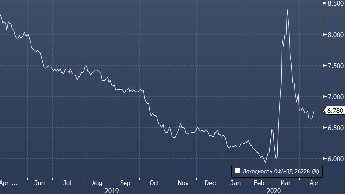 По итогам двух аукционов облигаций федерального займа, проведенных в среду 15 апреля, Министерство финансов России привлекло около 97 млрд рублей. В ходе второго аукциона ведомство разместило ОФЗ-ПД 26228 с погашением в апреле 2030 году на сумму в 66.1 млрд рублей, удовлетворив почти весь спрос, объем которого составил 77.4 млрд рублей. Доходность по цене отсечения составила 6.80%, а средневзвешенная доходность – 6.78%.