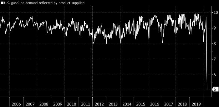 Обвал цен «с бензовоза», которые обычно довольно стабильны из-за высокой конкуренции между торговцами, является еще одним свидетельством хаоса, в который погрузился рынок топлива из-за коронавируса. Потребление бензина в США рухнуло до рекордно низких уровней (ProFinance.ru: график выше отражает динамику потребления бензина в США в млн б/д) на фоне резкого падения объема автоперевозок и такого же резкого роста запасов топлива. На этой неделе цена бензина в Милуоки оказалась даже ниже, чем в Фарго.