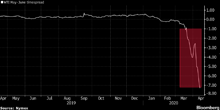 На момент написания статьи майские фьючерсы на WTI дешевели примерно на 10%, а июньские — всего на 1%.