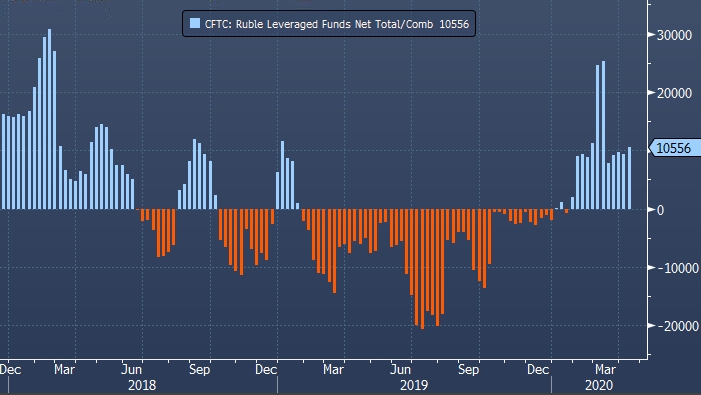 Если оценить статистику CFTC по рублю более подробно, то можно отметить, что сальдированная длинная позиция тех участников рынка, которые торгуют с кредитным плечом (leveraged funds), выросла на 12,5% до 10 556 контрактов на отчетной неделе.