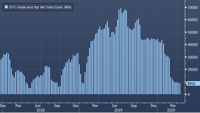 При этом длинная позиция по рублю управляющих фондами снизилась до 15-месячного минимума на уровне 8 856 контрактов. Показатель снижается 8-ю неделю подряд.