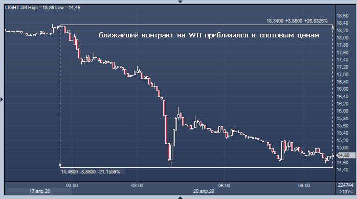 Цены на майский контракт на нефть марки West Texas Intermediate рухнули почти на 19% до 14.84 доллара за баррель. Ранее WTI упала до 14.47 долларов за баррель, самого низкого уровня с середины марта 1999 года, когда она торговалась всего по 14.40 долларов за баррель. Между тем, фьючерсы на нефть марки Brent подешевели на 2.42% до 27.40 доллара за баррель.