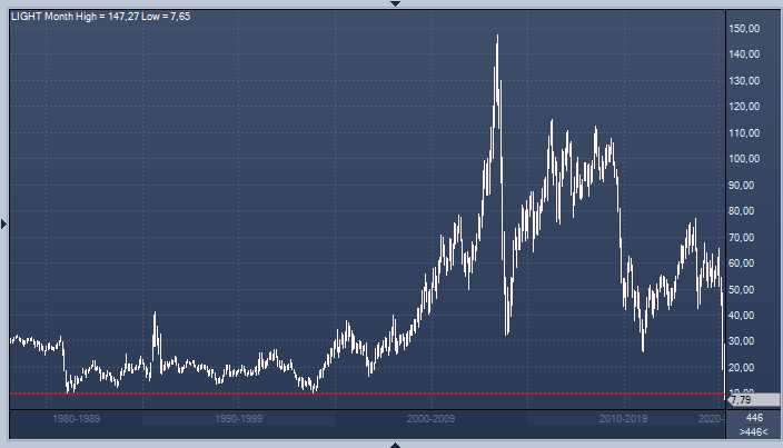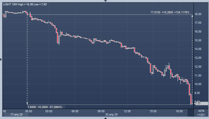Цена нефти в ходе торгов в понедельник пробила минимумы 1986 года и достигла минимальной отметки в районе $7.65 за баррель. Движение стало следствием ликвидации позиций участниками рынка в преддверии экспирации майского контракта – рынок остается в состоянии тяжелого стресса, учитывая крайне слабый спрос и дефицит мощностей для хранения нефти. Между тем, фьючерс на нефть с поставкой в июне в настоящее время торгуется около $22.63, а с поставкой в июле – в районе $27.90 за баррель.