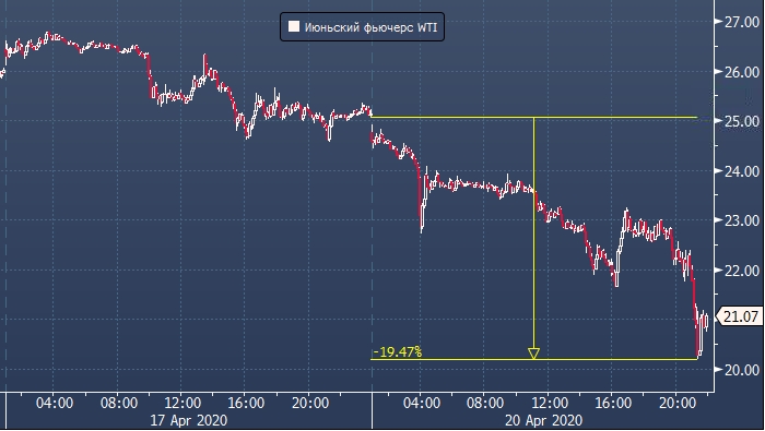 Майский фьючерс экспирируется во вторник. Соответственно со среды ближним (активным) фьючерсом становится июньский контракт на WTI. Июньский фьючерс в нижней точке понедельника снижался до $20,19 за баррель. Это минус 19,5% от цен закрытия прошлой недели.