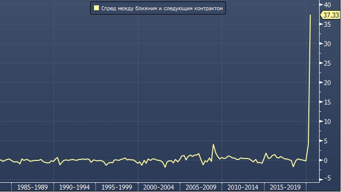 В понедельник был сформирован еще один антирекорд — впервые разница между ближним и следующим фьючерсом на WTI подскакивала до $40 за баррель.