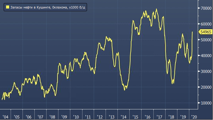 Запасы в нефтехранилищах Кушинга, откуда осуществляется поставка по торгуемым на Nymex фьючерсам, стремительно растут в 2020 г. Аналогичная ситуация наблюдалась в 2009 г., а также в 2015 г. Согласно данным Genscape, по состоянию на 17 апреля запасы за неделю до 17 апреля выросли до 61 млн баррелей, хотя пока официальные цифры Минэнерго указывают на то, что в хранилищах находится 55 млн баррелей. Свежие данные будут опубликованы в среду.