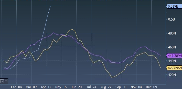 График запасов нефти в США: за последние 5 лет (фиолетовая линия), в 2019 году (желтая линия) и в 2020 году
