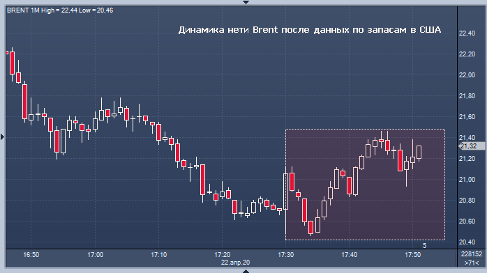 Цены на нефть на данный момент не проявляют ярко выраженной реакции на отчет Минэнерго США по запасам сырья в стране. После качелей в 30% вчера вниз и сегодня вверх рост, падение и снова рост на 60 центов после выхода данных сложно назвать реакцией. В целом данные по запасам, на удивление, отвечали прогнозам аналитиков. После ситуации с майским контрактом на WTI можно было ожидать полного переполнения всех хранилищ в стране. Но пока этого не видно.