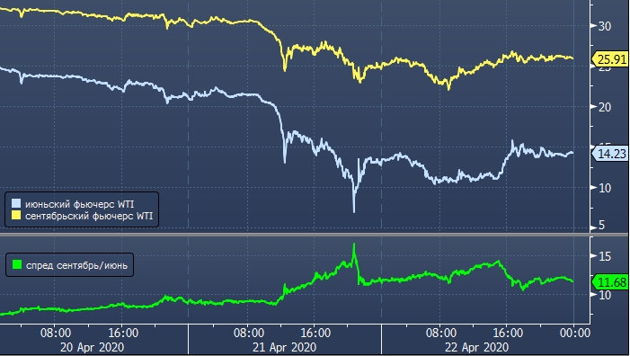 Эти цифры указывают на одну из причин обвала июньских контрактов во вторник, когда они дешевели на 68% до $6,50 за баррель. В то же время дисконт этих контрактов к фьючерсам с более поздними сроками поставки — или контанго — также сильно увеличился: спред между июньскими и июльскими контрактами вырос почти в 2 раза до $10,99 за баррель.