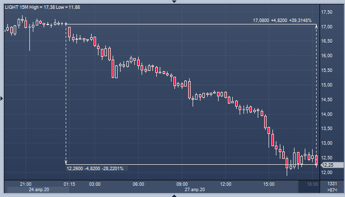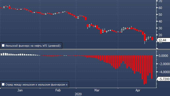 Новости привели к заметному росту давления на ближней части фьючерсной кривой, в результате чего указанный контракт упал до $11.18, а спред между ним и июльским фьючерсом вырос до $6.28 против $4.07 на момент закрытия торгов в пятницу. Нефть с поставкой в июне в настоящее время торгуется в районе $12.37, теряя более 28%.