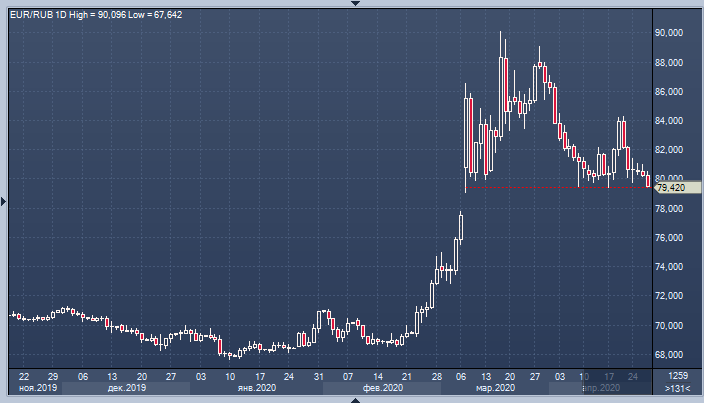 Курс рубля демонстрирует весьма неплохой рост в ходе торгов в среду, и если USDRUB только готовится штурмовать минимумы апреля, то EURRUB их уже пробил и достиг минимальной отметки с 9 марта в районе 79.42 рубля за евро.
