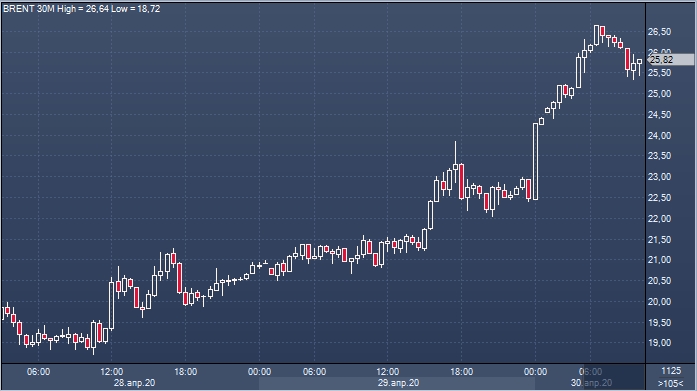 Котировки североморского сорта Brent утром в четверг, 30 апреля, растут на 6% до $23,91 за баррель, нефть WTI прибавляет в цене 11,6% до $16,80 за баррель.