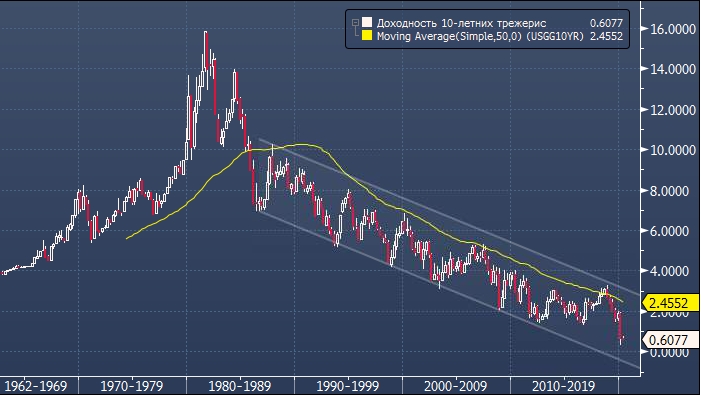 Казначейские облигации США пользовались спросом как защитный актив в период рыночной турбулентности, и это способствовало снижению доходности индикативных бумаг более чем на 130 базисных пунктов в этом году, хотя в этом месяце падение ставок остановилось после масштабных стимулирующих мер со стороны центробанков и правительств. К концу торгов в среду доходность составила около 0,63%.