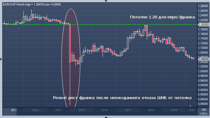Напомним, несколько лет, до начала 2015 года, ШНБ был увлечен таким валютным экспериментом, как поддержание некоего предела укрепления курса нацвалюты к евро, известного как «потолок» для франка («пол» для евро), на уровне 1.20, при котором в случае снижения курса EUR/CHF в район 1.20 регулятор усиливал интервенции по покупке евро и продаже франка. Это делалось для стимулирования экспорта из Швейцарии в еврозону. За годы ШНБ накопил миллиарды резервов в евро. В конечном итоге ЦБ отказался от этой привязки, следствием чего стало разорение многих инвесторов, которые свято верили в незыблемость потолка для франка.