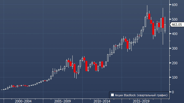 На графике представлена история динамики акций BlackRock с момента IPO в 1999 году по $14 за штуку.