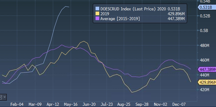 График запасов нефти в США: за последние 5 лет (фиолетовая линия), в 2019 году (желтая линия) и в 2020 году
