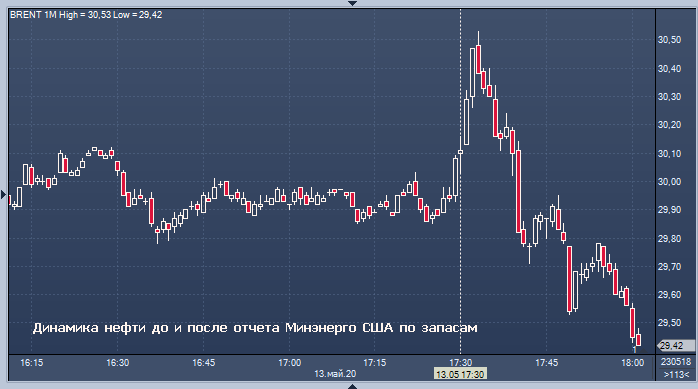 По данным Американского института нефти (API), которые вышли вчера, запасы нефти в США выросли на 7.6 миллиона баррелей до 526.2 миллиона за неделю, завершившуюся 8 мая, тогда как аналитики предполагали, что они вырастут на 4.1 миллиона баррелей. Согласитесь, увидеть после этого в сегодняшнем отчете Управления энергетической информации Минэнерго США сообщение о том, что запасы сырой нефти и вовсе сократились, пусть и незначительно, было довольно неожиданно. Казалось бы, такая информация могла бы взорвать рынок. Но нет, мы этого не увидели: цены подскочили в моменте на 60 центов, а потом упали на 90.