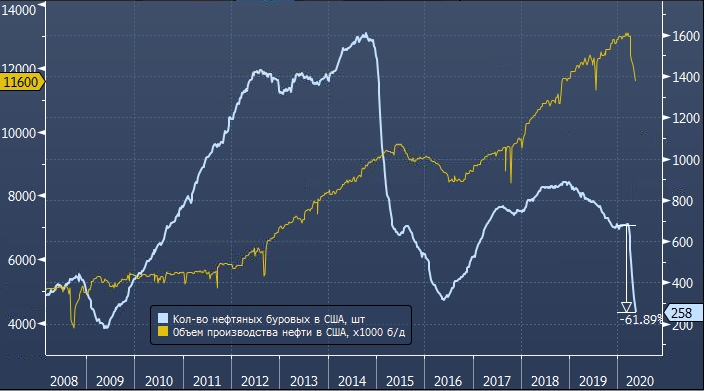 Абсолютный максимум количества нефтяных буровых в США был достигнут в октябре 2014 года. Тогда было зарегистрировано 1609 штук. Соответственно, с того время число активных нефтяных буровых сократилось в 6 раз.