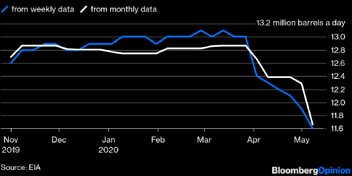 Если так и есть, то реальный уровень добычи нефти в США в настоящий момент может составлять всего 10.6 млн б/д, что на 2.4 млн б/д (18%) ниже плато, достигнутого этой зимой. Кроме того, эти цифры (18%) почти соответствуют обязательствам по сокращению добычи участников новой сделки ОПЕК+ (22%).