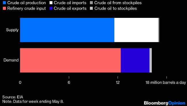 На неделе до 8 мая этот коэффициент составил рекордные -0.914 млн б/д. Иными словами, в последний отчетный период могли произойти три вещи: 1) реальное предложение нефти в США оказалось на 0.914 млн б/д ниже официального, 2) реальный спрос оказался на 0.914 млн б/д выше официальногоо, или 3) имела место комбинация этих событий.