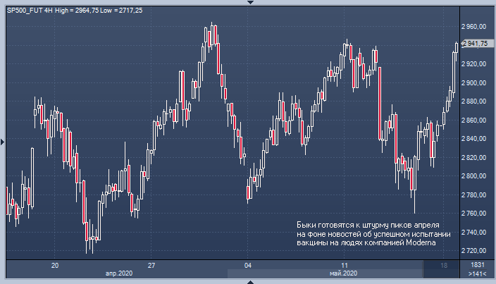 Перспективы получения вакцины, которая позволит миру вернуться к обычному ритму жизни, воодушевили инвесторов. Дополнительным поводом для оптимизма стали заявления Джерома Пауэлла: глава ФРС предостерег о возможности длительного периода восстановления экономики США, однако инвесторы сфокусировались на его заявлениях о необходимости дополнительных мер поддержки и готовности ФРС к стимулированию экономики.