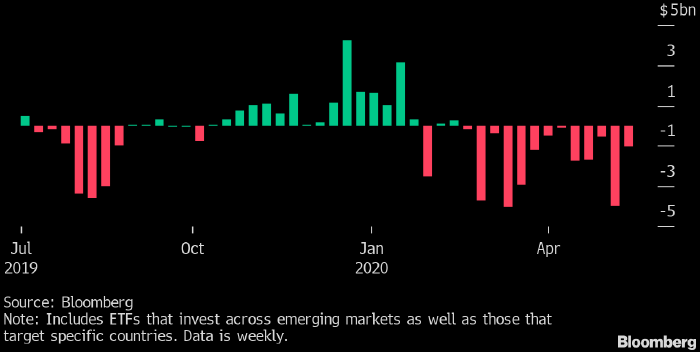 На неделе до 15 мая инвесторы продолжили продавать активы стран EM на фоне эскалации конфликта между США и Китаем. В отчетный период отток капитала из торгующихся в США соответствующих биржевых фондов (ETF) составил $1.02 млрд ($887.3 из фондов акций и $134 млн из фондов облигаций, см. график выше), следует из данных Bloomberg.
