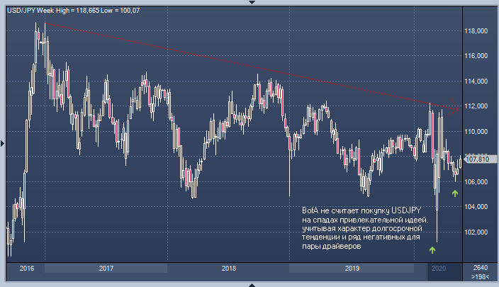 В банке придерживаются лагеря медведей в оценке перспектив USDJPY. Локдаун ключевых экономик мира и сокращение кэрри позиций в иене в марте и, вероятно, апреле компенсировали давление на USDJPY, однако стремительное расширение баланса ФРС вкупе с фискальными мерами в США в обозримом будущем останется фактором давления на доллар. В свою очередь, снятие ограничений поддержит восстановление экспорта из Японии, тогда как низкие цены на нефть предполагают снижение импорта. В BofA также отмечают общее ослабление активности M&A (слияния и поглощения) и непривлекательность хеджирования инвестиций в иностранные облигации как факторы, которые будут способствовать постепенному укреплению позиций иены в ближайшие месяцы.